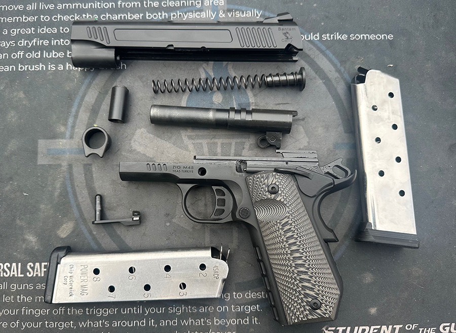 The redundant reliability of the modern breed of polymer-framed 9mm pistols has truly spoiled the American shooter. I know guys who clean their handgun biannually, if that often. If you want your 1911 pistol to run, you need to do so far more often than that. Also, the 1911 is a different kind of creature than your plastic fantastic blaster. Browell’s has some excellent “how to” videos regarding disassembly and cleaning of the 1911 pistol.