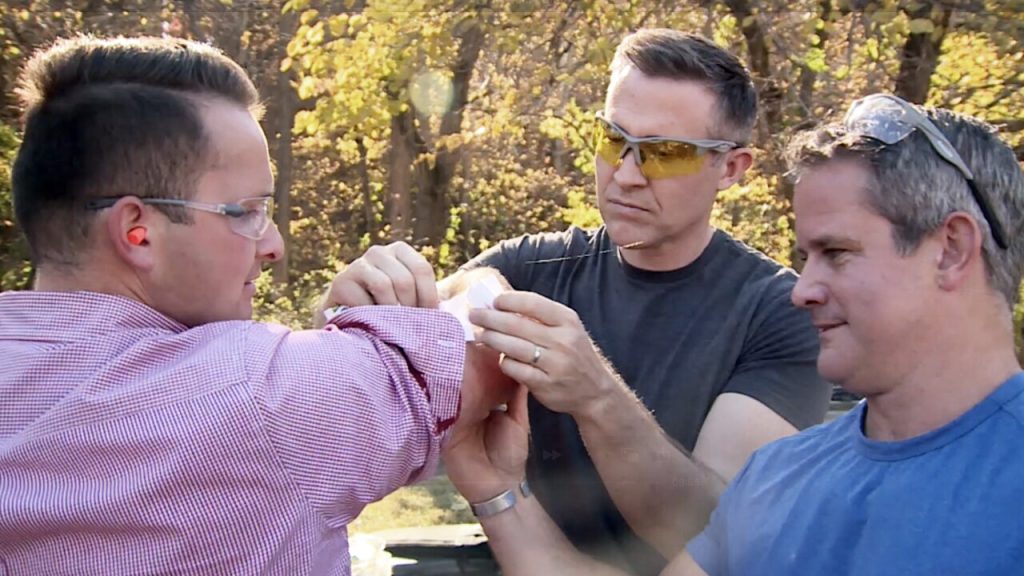 Given all of the safety failures on conspicuous display during the press event, it shouldn’t be a big surprise that something bad happened. Kunce and Kinzinger were almost asking for it. As Kunce was shooting at the steel targets, a bullet fragment ricocheted and struck a reporter in the arm.