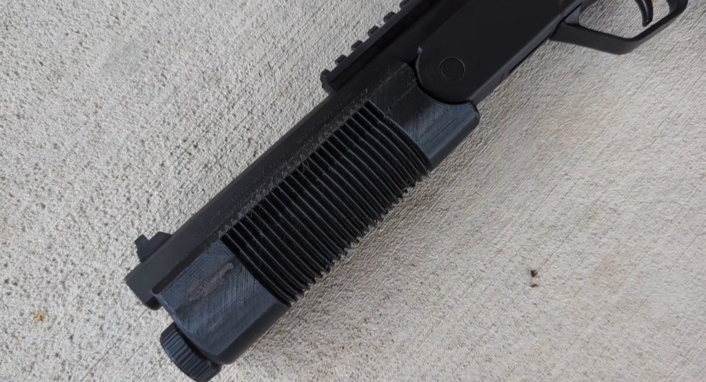 The Brawler has just about the smallest handguard possible up front. It’s fine, especially when fired like a traditional pistol. However, what if we increase the size of that forend? I wasn’t the first guy to think this. A FOSSCAD user named Veld_Khan designed a larger, more shotgun-like series of forends that can be 3D printed.