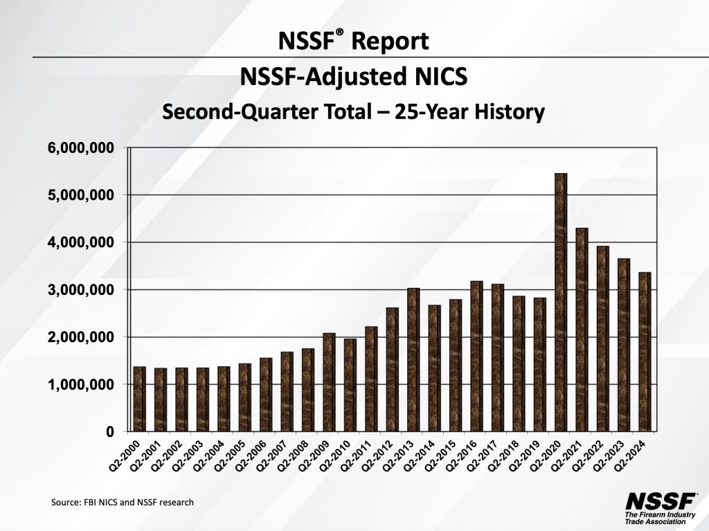 The second quarter 2024 NSSF-adjusted National Instant Criminal Background Check System (NICS) figure of 3,364,270 reflects a decrease of 7.9 percent as compared to the second quarter 2023 figure of 3,654,134.