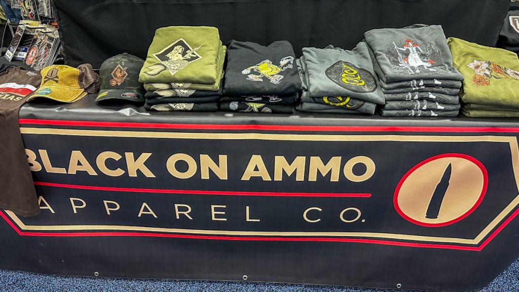 Finally, the one booth I really enjoyed visiting the most was that of Black On Ammo Apparel Company. Owner Shawn Menzie, a former Marine Combat Engineer and Primary Marksman Instructor, has a unique design style and does all his own design work – which is copyrighted, by-the-way.
