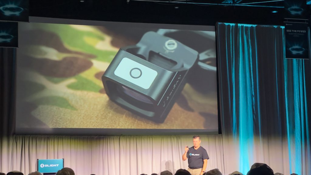 David Chow of Olight announced the company’s first red dot pistol optic, and the unique features of its design. The rechargeable Osight – also available as a green dot – utilizes a magnetic charging cover that shows you the percentage of power in the unit.