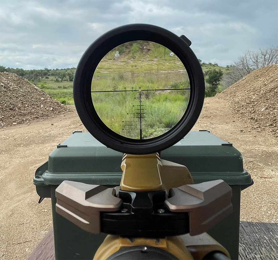 Here’s the view at 10X. The reticle becomes useful as you zoom from about 4X magnification on up. Again, in daylight, there’s no need for illumination. In low light, the “box” around the center dot is brightly lit while the rest of the reticle and subtensions are more subtly illuminated.