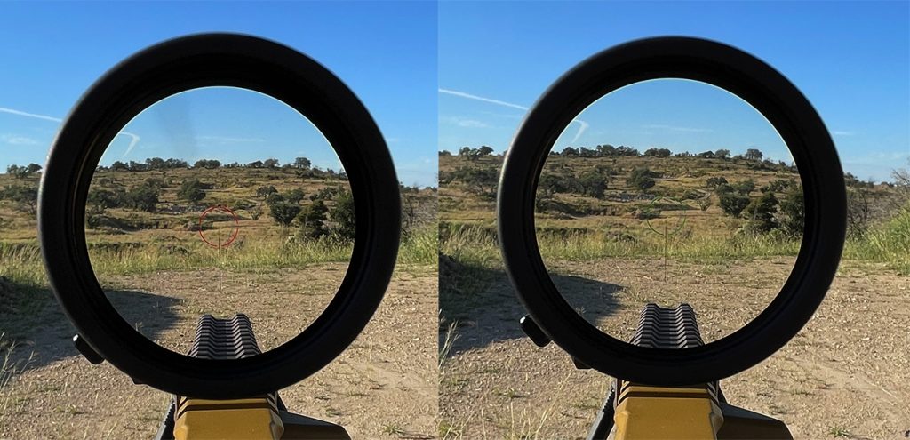 The RS.6 has you well covered for close-in work as it’s a true 1X, non-magnified image (above) The etched “acquisition ring” is visible in daylight on its own, but can also be illuminated along with the center dot. Again, Maven gives you your choice of either red (above left) or green (above right) illumination at five different brightness settings.