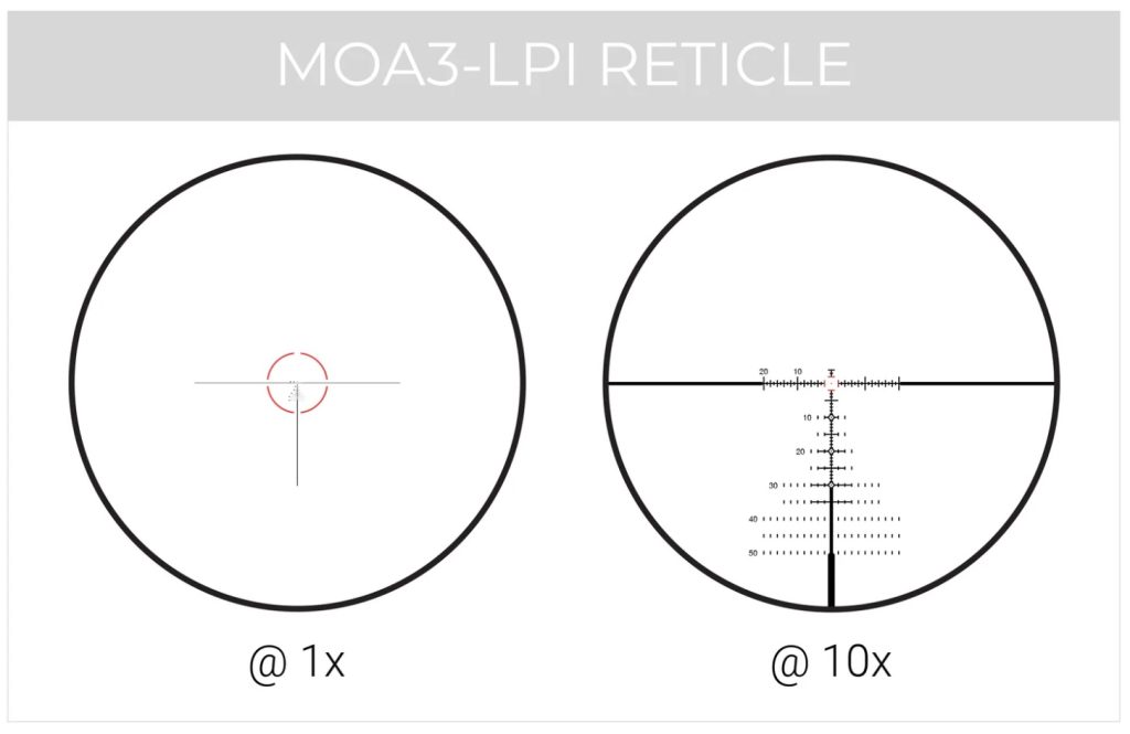 The scope I tested has Maven’s MOA3-LPI reticle. They also offer an MRAD version. Being a FFP scope, the ranging is accurate at all distances. The graphic above gives you a good idea of what you’ll see at 1X and 10X magnification.