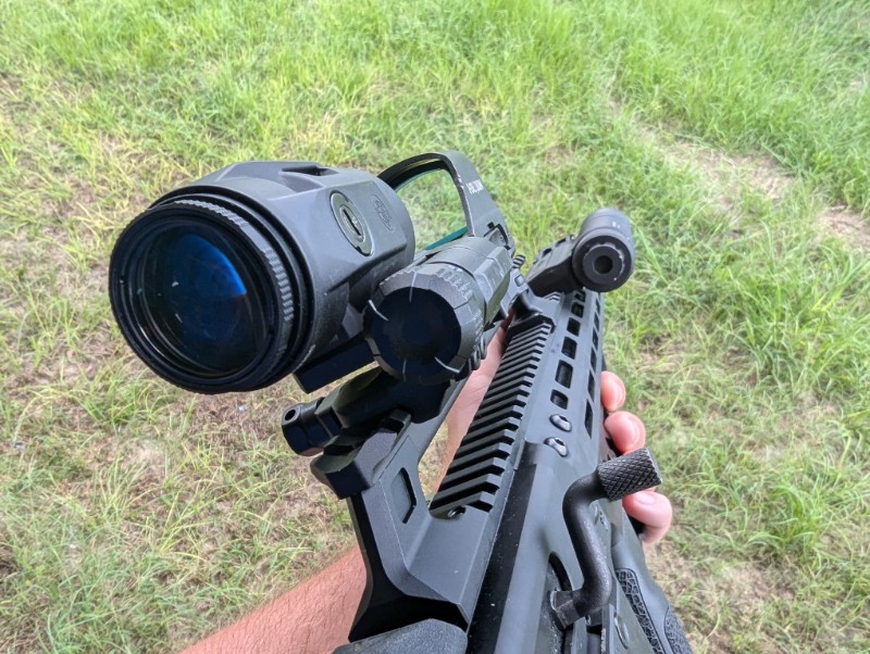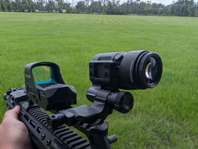Once you’re within the eye relief zone, the eye box feels generous. It’s easy to see completely through with ease. The reticle of the HS510C looks good, crisp, and solid. Viewing through the magnifier actually makes the reticle seem brighter, but from my understanding, that’s just something magnifiers tend to do. If you have your red dot dialed up to 11, you might suddenly find it to be too bright.