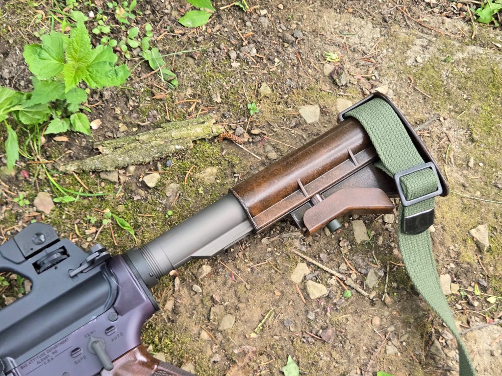 I added the Cheating Death fakelite stocks. I think they actually go well with the mismatched gray finish. It has the look of a rifle that’s been through the apocalypse and been rebuilt a number of times since. Initially I just tossed a basic black GI silent sling on it, but then I stumbled onto a seller on Ebay with M1 carbine style slings. They have traditional width M1 slings in black, OD, or tan nylon, or OD ones done from new old stock GI cotton canvas webbing.