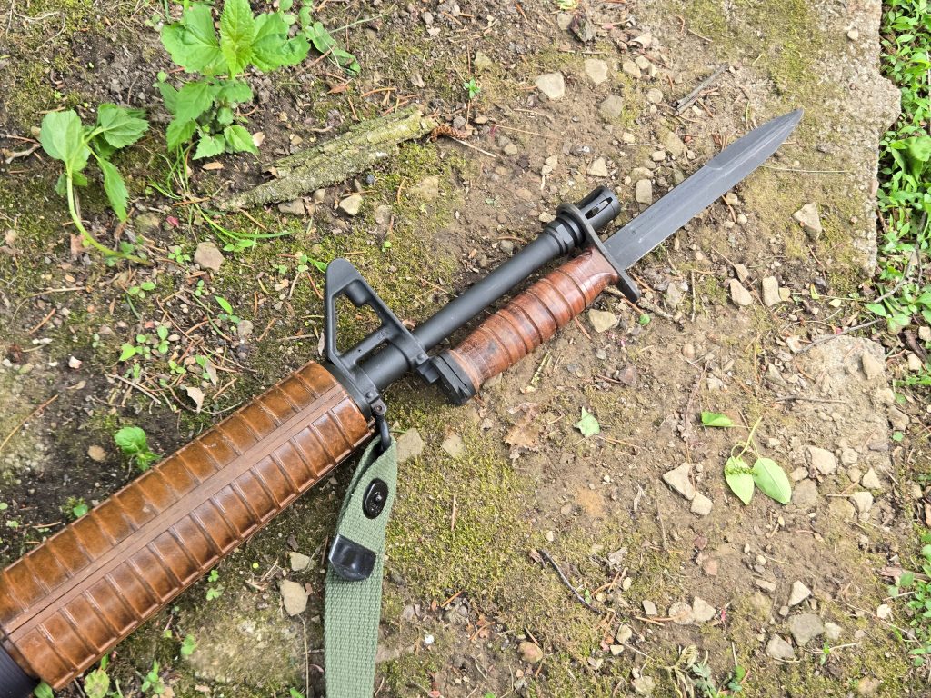While I was adding accessories, I added another Ebay find. I picked up an M7 bayonet a while back with a stacked leather handle. That was never an issue variation but it’s a real GI Imperial contract blade that someone did a very nice job on with a custom leather handle. I asked the seller about it and they said they got a few of them, in the wrapper, in a batch that way. I’m not sure who did them, but they’re pretty nice and the stacked leather goes well with the fakelite furniture. I don’t see any currently listed by that seller, but I have seen similar ones pop up a couple times since I got mine.