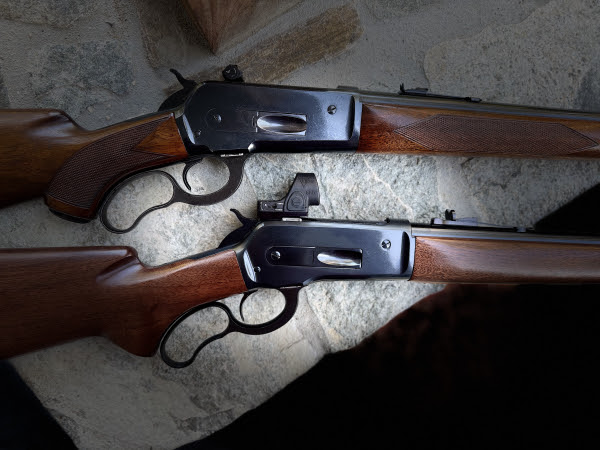 Side by side: the Winchester Model 71, born in 1935 from Browning’s 1886 action, and the Browning-Miroku Model 71 revival of the 1980s. Different eras, same big-woods authority.
