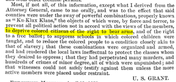 President Ulysses S. Grant complained in a letter to Congress in 1872 that the Ku Klux Klan’s objectives were “by force and terror, to prevent all political action not in accord with the views of the members, to deprive colored citizens of the right to bear arms…and to reduce the colored people to a condition closely akin to that of slavery.” See H. Journal, 42nd Cong., 2d Sess. 716 (1872).