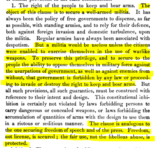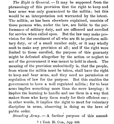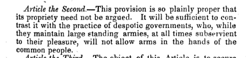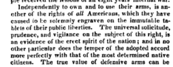 Of all the commentary cited in this article, Abbott may be the writer most in line with modern gun control advocates, as he rejects the idea of the Second Amendment being for personal self-defense. Yet even he is clearly talking about an individual right to own arms, but those arms must be useful to the militia. Of course, modern gun control advocates would hardly want to cite Abbott, because in today’s terms, he’d support the right to own an AR-15 but not a small handgun.