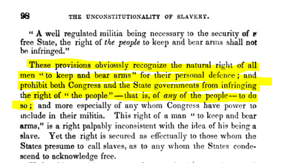 Joel Tiffany, a prolific writer of the 19th century, wrote in his work A Treatise on the Unconstitutionality of American Slavery that the Second Amendment protects the right of individual to defend themselves. And this right belongs to everyone, because no limit on it is included.