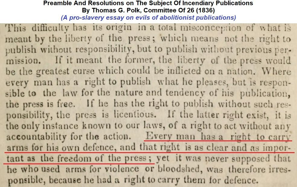It’s also interesting to look at a pro-slavery perspective in this context. While someone like Thomas G. Polk would find little in common with abolitionists, he did apparently agree on the individual right view of the Second Amendment: