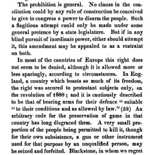 In his 1825 book A View of the Constitution of the United States of America, Rawle explained that the Second Amendment prohibited congress from disarming the people. He contrasted the right from its much more limited English version, complaining that the latter had effectively disarmed most of its subjects.