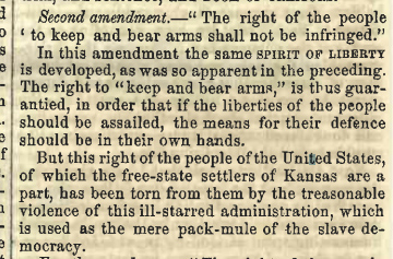 Likewise, Senator Charles Sumner’s 1856 speech “The Crime Against Kansas “bristled at the mere suggestion that citizens in Kansas who opposed slavery should be disarmed of their Sharps rifles by the proslavery government: “Never was this efficient weapon more needed in just self defence, than now in Kansas, and at least one article in our National Constitution must be blotted out, before the complete right to it can in any way be impeached.”