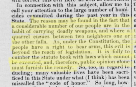 Governor John B. Weller of California (also previously a Senator from 1852-1857) wrote in an 1860 letter to the legislature that homicides were too high, casting blame on people in the habit of carrying deadly weapons. But he acknowledged that there was not much that could be done, because the Constitution secured the right to keep and bear arms.