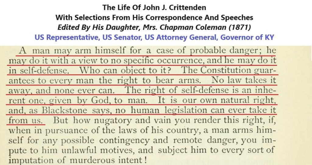 Crittenden wrote that no law can take away the right to bear arms, as it is a natural right guaranteed by the Constitution’s Second Amendment.