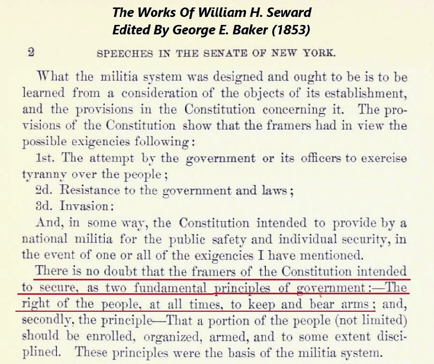 William Seward was our 24th Secretary of State, serving under Presidents Lincoln and Johnson. He was also a Senator and Governor of New York. He considered the right of the people “at all times, to keep and bear arms” to be one of the two fundamental principles of government the framers meant to secure.