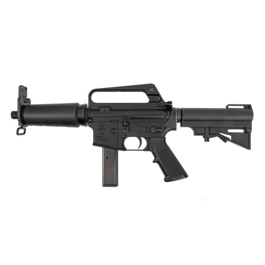 The DOE is built on H&R’s 635 lower and fitted with their CAR style HAR-15 brace and standard A2 grip. The guns are chambered in 9mm and feed from Colt SMG mags. They come with one H&R branded 32 round magazine. They have a 7.5 inch barrel with the noted DOE foreend (which was also used on the M231 Port Firing Weapon), and folding front sight. H&R’s DOEs  come with threaded barrels, which folks seem to have mixed opinions about. Obviously that’s a good thing for folks wanting to run a suppressor, but the basic 80’s era DOEs were not threaded, so some folks are grumbling about that. You cannot please everyone though. Personally, I like that it’s threaded because I have a couple of cans I can run on it.