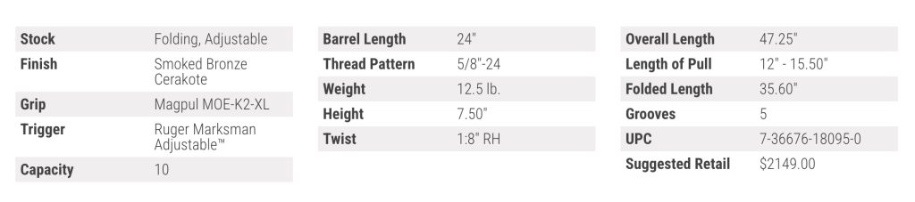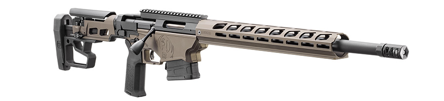 The new Ruger Precision Rifle features include: a heavy contour, cold hammer-forged barrel; an improved muzzle brake; a Magpul MOE-K2 vertical pistol grip; and a black DLC-coated bolt. The aluminum handguard is equipped with M-LOK slots for compatible accessories and also features an ARCA rail machined into the underside. The magazine well, handguard and stock body sport an attractive Smoked Bronze Cerakote finish.