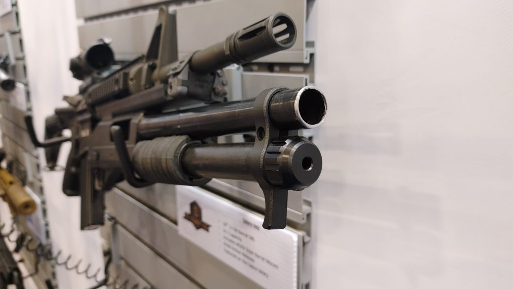 Since the rifle has a stock, it also seems like it would be an SBS, but previously dual-barreled firearms, like the Savage Model 42, were considered AOWs when the barrels were shortened. I’m not sure whether the mounting setup not being permanent affects this design. Regardless, it’s an NFA firearm.