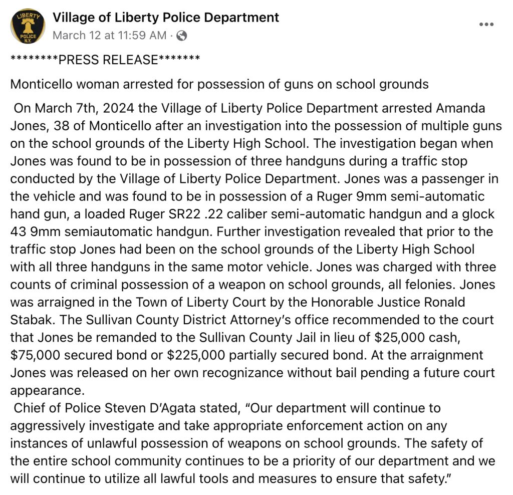 A recent press release by the ironically named Village of Liberty Police Department in New York shows us just how bad things can go for you if you choose to talk to the police. Not only did a woman get in trouble for having pistols in the supposedly free state of New York, but she also landed herself several felonies charges by telling police where she had been with the guns.