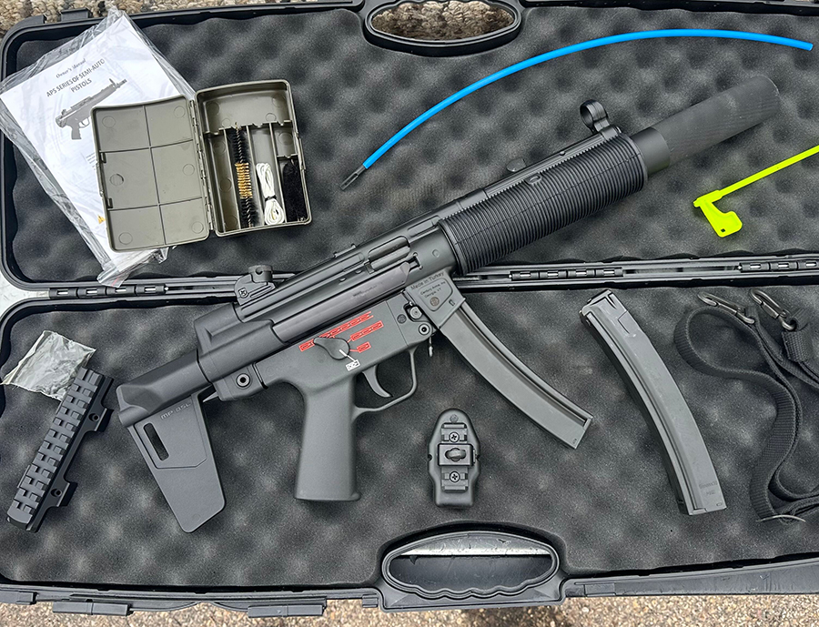 As with the entire AP5 series, the AP5-SD is built with HK machinery and uses the original pattern MP5 magazines. Yes, the faux suppressor can be removed from the barrel which has 1/2×28 TPI RH threading. If you have a 9mm can of your own you can easily install it.