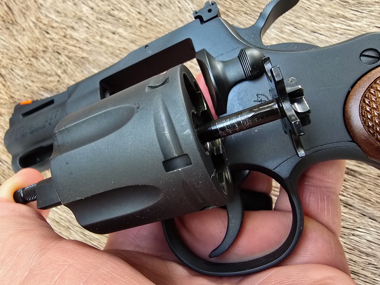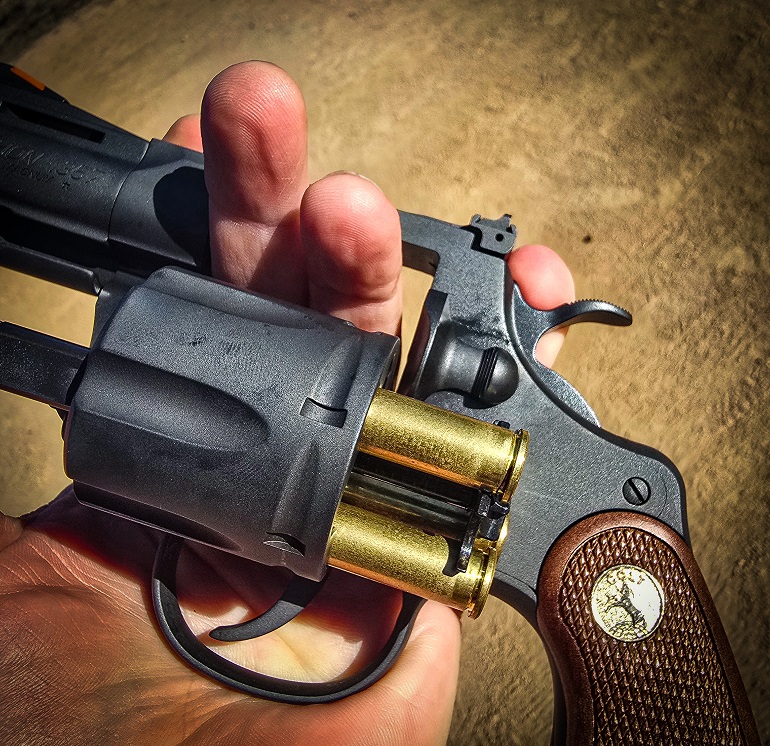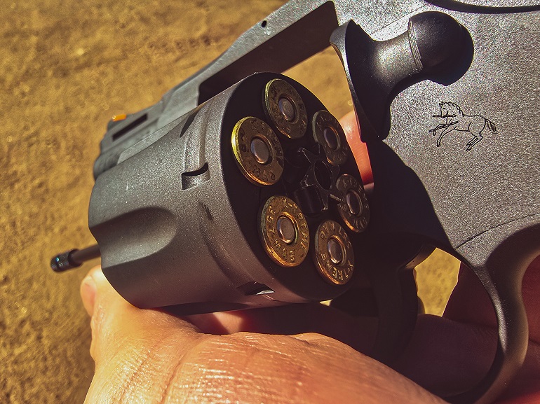 Like all short-barreled magnums, you’re going to have to tip the muzzle up and hammer the ejector on empties if you want the cylinder to give up all six shells with a quickness. That ejector rod’s just not long enough to push the empties all the way out, so you’re going to need a little momentum. This particular gun was finicky about brass fully ejecting, at least in the beginning. Nickel-finished cases fell smoothly, as did all cases after a couple of hundred rounds.