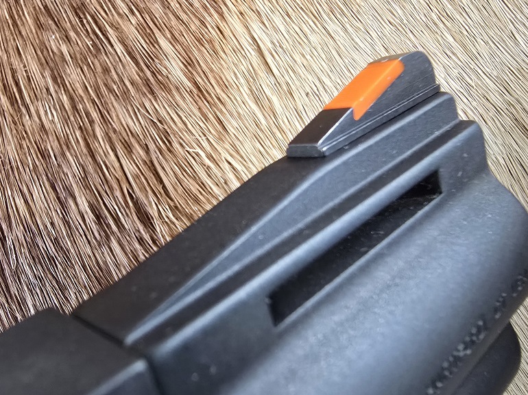 This snub-nosed version has a red ramp front and the target rear sight with a U-shaped notch. It’s adjustable for elevation and windage. I’ve been shooting these guns quite a bit since they came out in 2020, many fthousands of rounds now, and have yet to have a rear sight come out of alignment or lose adjustment in any way.