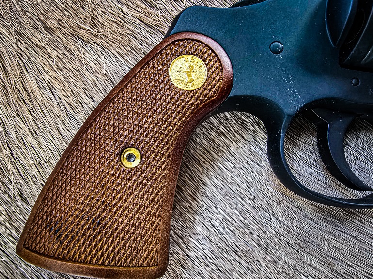 This particular Python includes checkered walnut grips with Colt’s traditional gold “Rampant Pony” medallion. Like all of the modern Pythons, these are interchangeable with almost all of the current or old grips. Colt’s choice with this gun is appropriate, as they’re practically identical to the original service style grips from the 1960’s. They look good and feel good. With the right holster, the grips ride well against the body, easy to grab and draw.