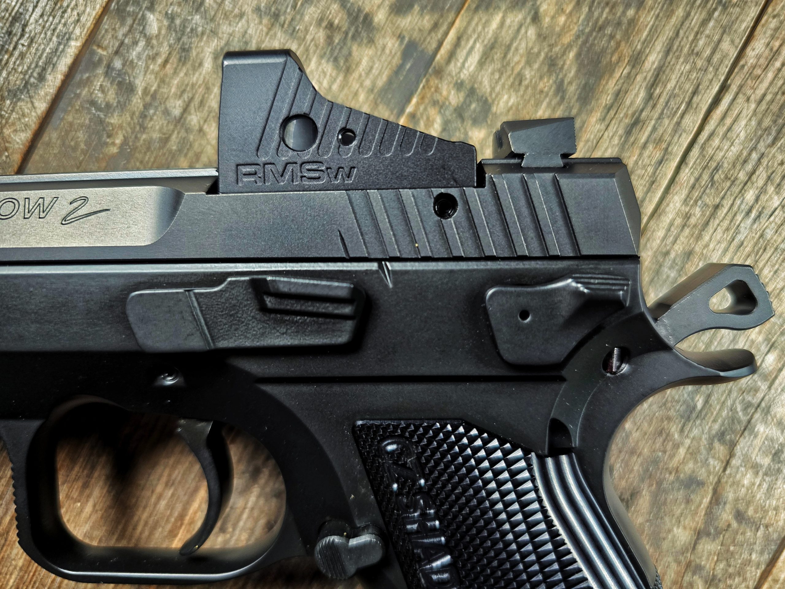 One big, modern differentiator between the Shadow 2 Carry and the P-01 is the slide. Most obvious is that it’s optics-ready. It’s milled for the Shield RMSc footprint and the optics cut is also as low as CZ could make it, which is great because it co-witnesses with factory height iron sights.
