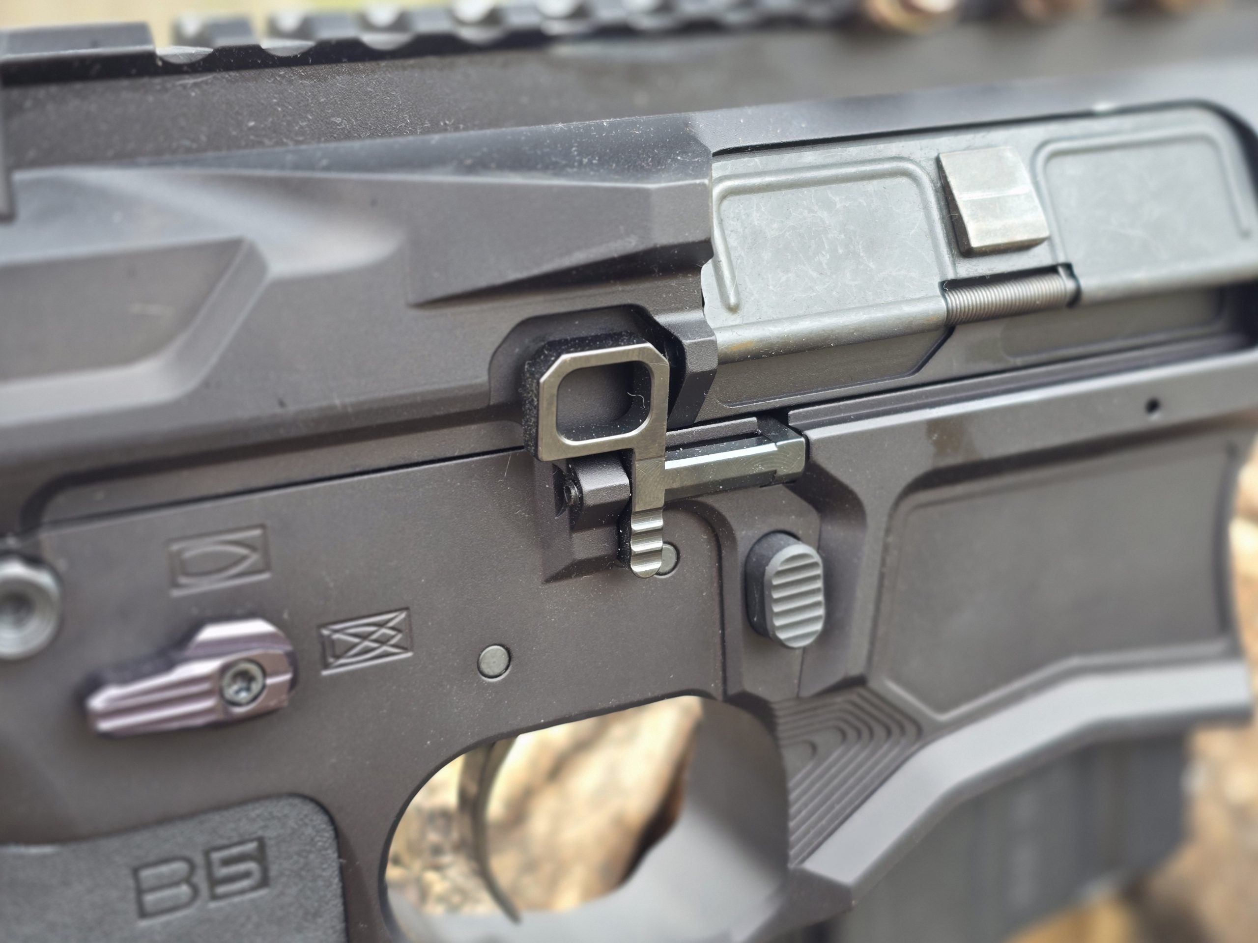 Over on the left side is another magazine release. Fully ambi, indeed. I appreciate the placement of a left-side release like this one as the shooter can grab the magazine with the left hand while pressing the release with the left thumb and stripping the magazine out. Note how the upper receiver is modeled around the bolt release lever here, too.