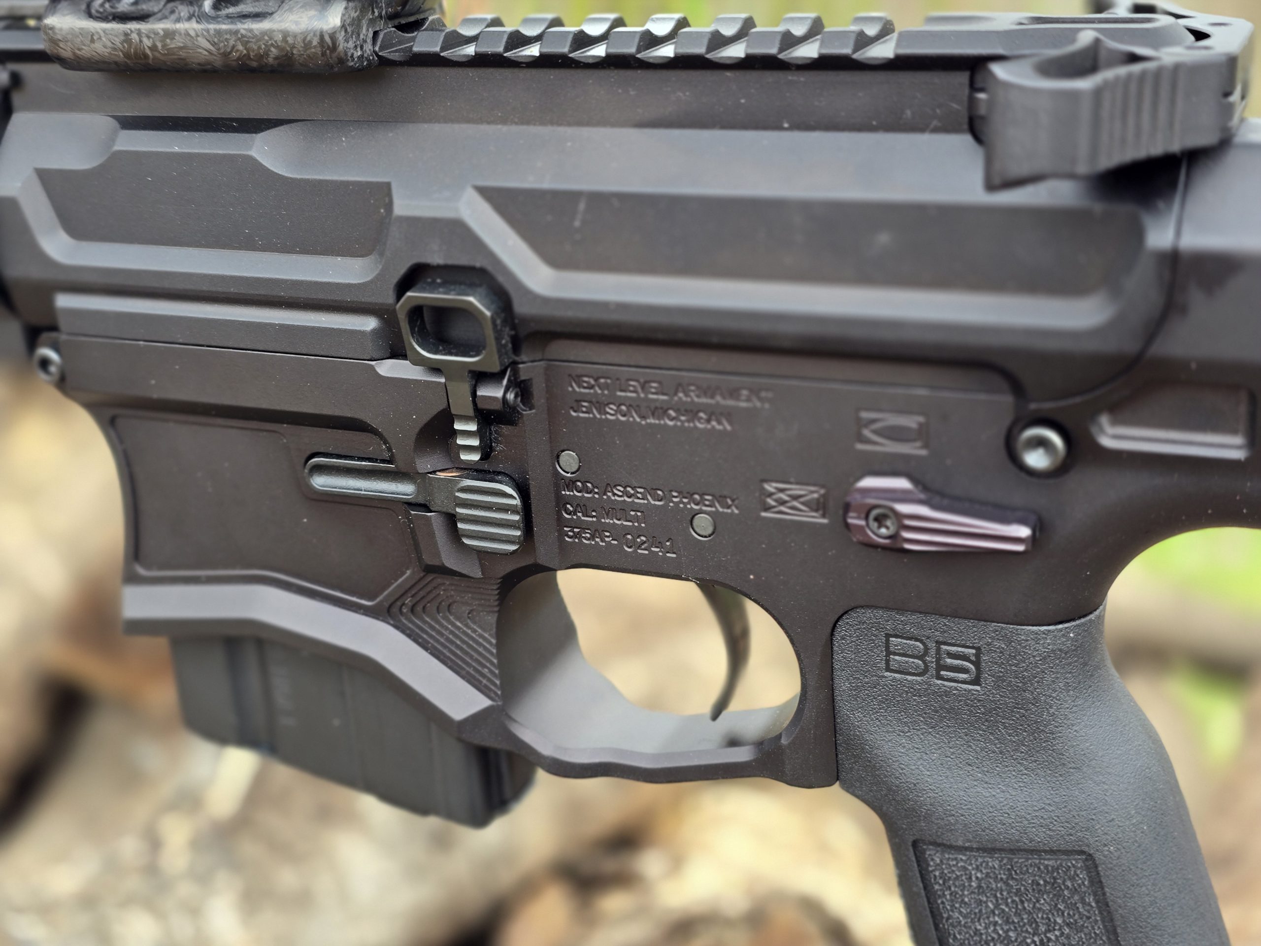 Not to mention, of course, the right-side bolt stop and release. The skeletonized, oversized control serves both functions, making the Next Level Armament Phoenix Premium a truly fully ambidextrous AR-15. Oh and, yeah, the billet upper receiver looks great, too. As you can see it has been designed and machined specifically to accommodate the right-side bolt release.