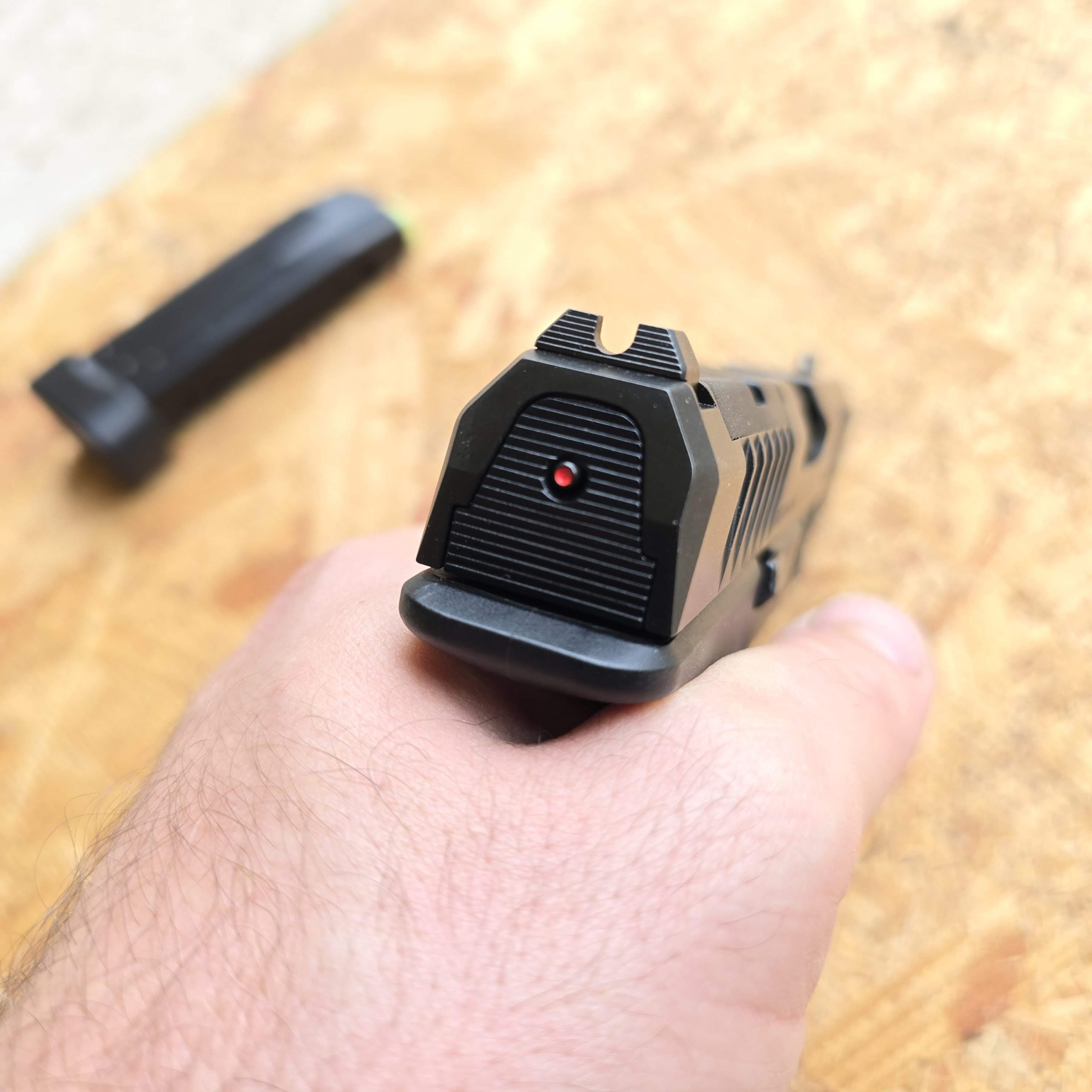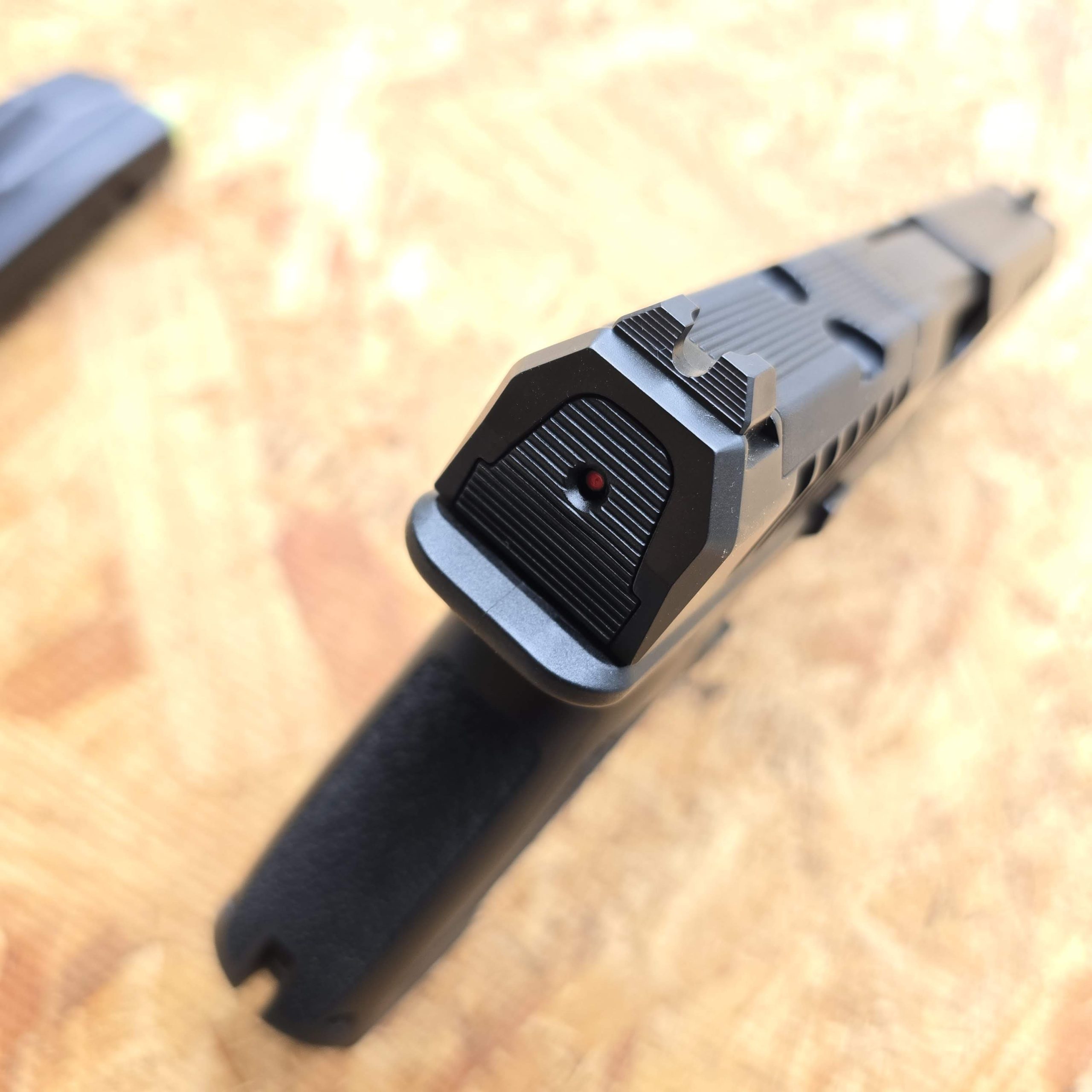 Up front is a white dot in another serrated steel sight. Good quality for a gun at this price point. We all know of more expensive pistols that have polymer sights.