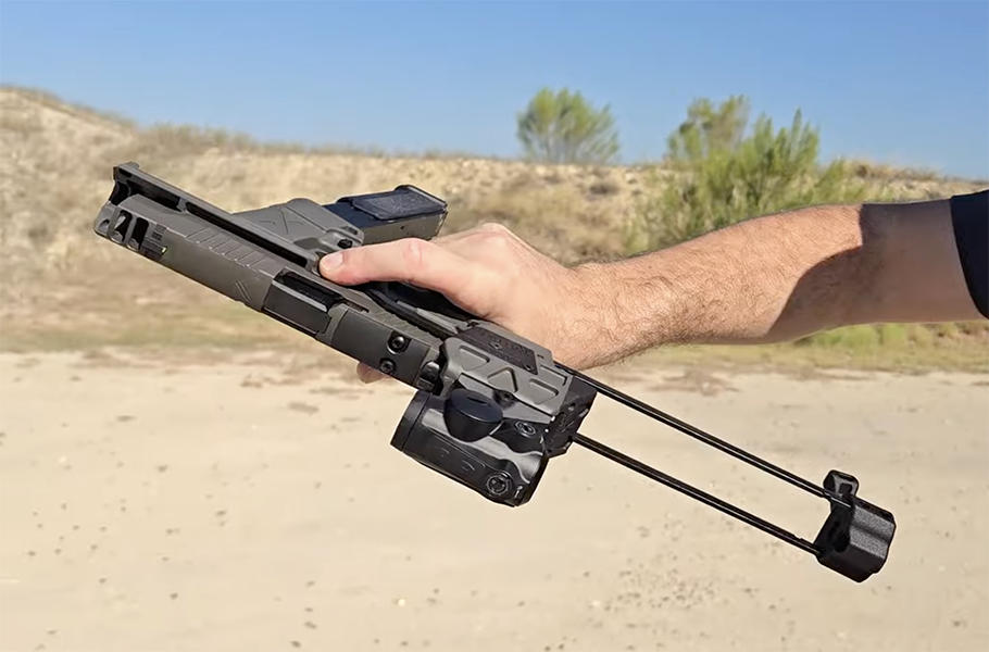 On the right side of the gun is a quick deployment lever for the pistol brace. Press it down and the sprung brace shoots out into position. Press the same level to collapse the brace when you’re finished having fun.