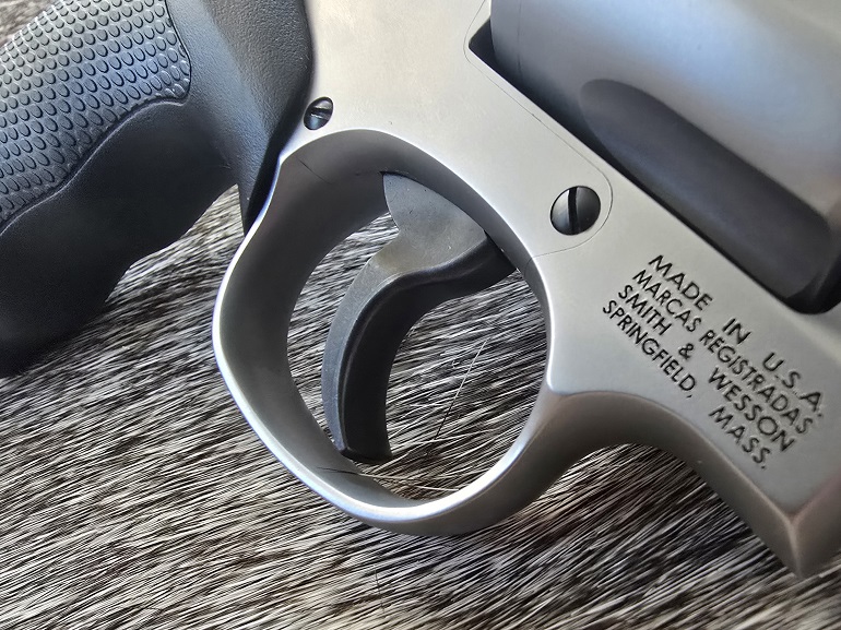 The stainless Combat Magnum sports the well-known S&W trigger. The double action trigger stacks up front, with a very small bit of grit at the start. From there, a straight pull back follows through to a very crisp break. The single action break is wonderful, crisp and short, though not particularly light in weight. The double action pull averaged 10 lbs. 9.0 oz. over five pulls. Single action came in at 5 lbs. 1.4 oz. using my Lyman digital trigger scale. The trigger shoe itself is wide and smooth, with this version sporting a black finish that matches the hammer and cylinder release.