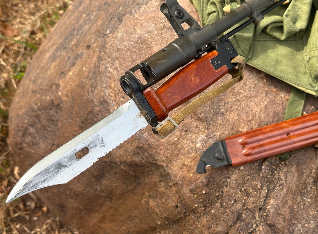 Also, the new AK-74 muzzle brake was designed to allow the use of the existing AKM bayonets. The Type II AKM bayonet, with Bakelite handle and sheath, was an ingenious design. Not only would the bayonet create a nasty wound, it was a multi-purpose tool with a built-in wire-cutter (long before the US Army M9 bayonet) and you could also put the bayonet ring into the scabbard and use it as an ice pick or a light duty hammer.