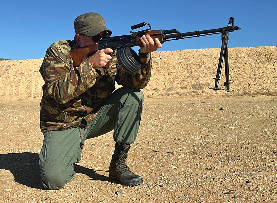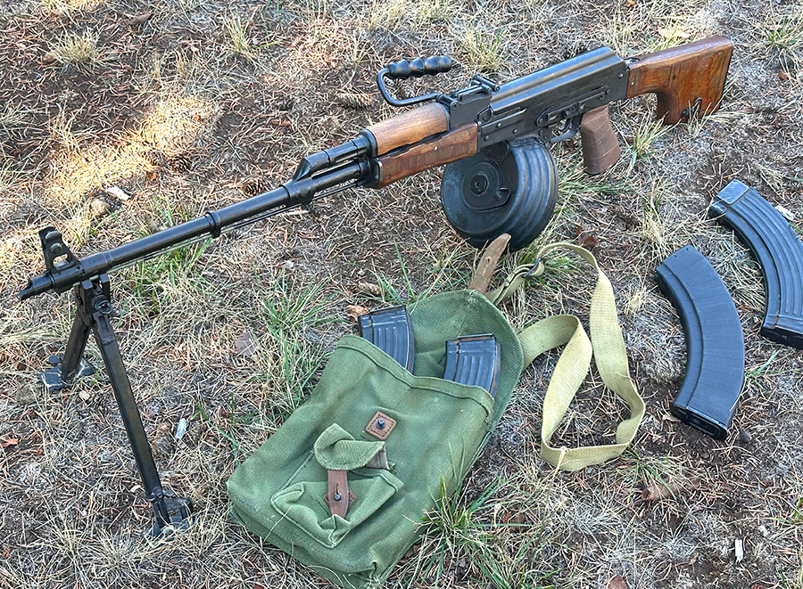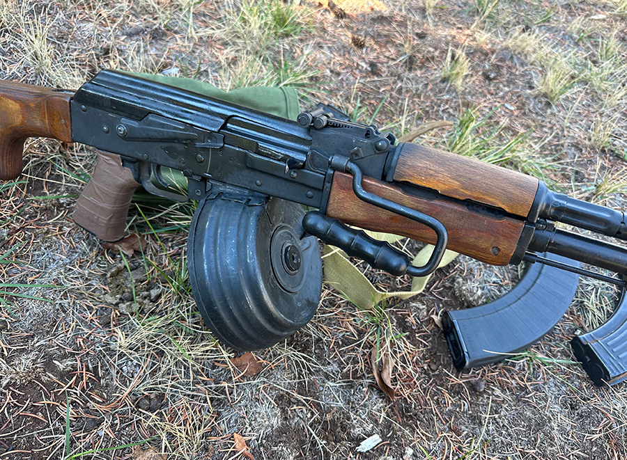 The heavy barrel is 23 inches and has a long cleaning rod onto which the steel bipod clips in place when that feature is not deployed. Unlike the lighter-barreled SAW of the NATO forces which used “quick change” barrels, the RPK barrel is fixed and cannot be swapped out.
