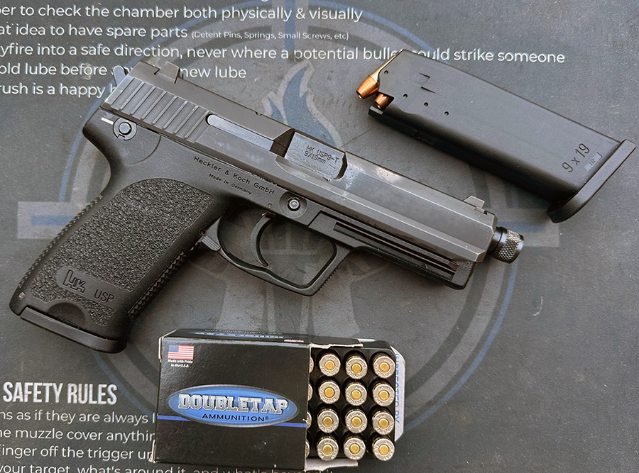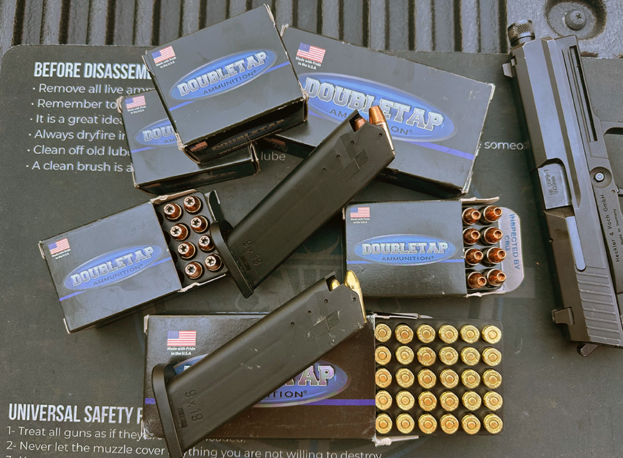 This review was not my first outing with the USP 9, but I did have a bunch of new 9x19mm ammunition that I wanted to try out in the gun. From the Double Tap ammunition website, I ordered their 124g. FMJ-RN Match, the 115g DT Lead Free SC-HP, the 124g DT Lead Free SC-HP, the 77g Lead Free SC-HP. That load is a real screamer at 1600 FPS! Finally, I ordered some 145g 9mm “Snakeshot Defense.”