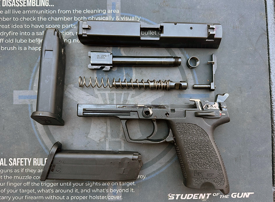 A corrosion resistant finish was applied to the slide, barrel and steel parts. The polymer frame and magazines are naturally rust-proof. Standard barrel length for the USP 9mm was 4.3 inches. Several years ago, I installed an HK USP-T threaded barrel to allow the use of a suppressor. The sights are three white dot Patridge-style and the external extractor claw is more than up to the task of ripping out fired cases.