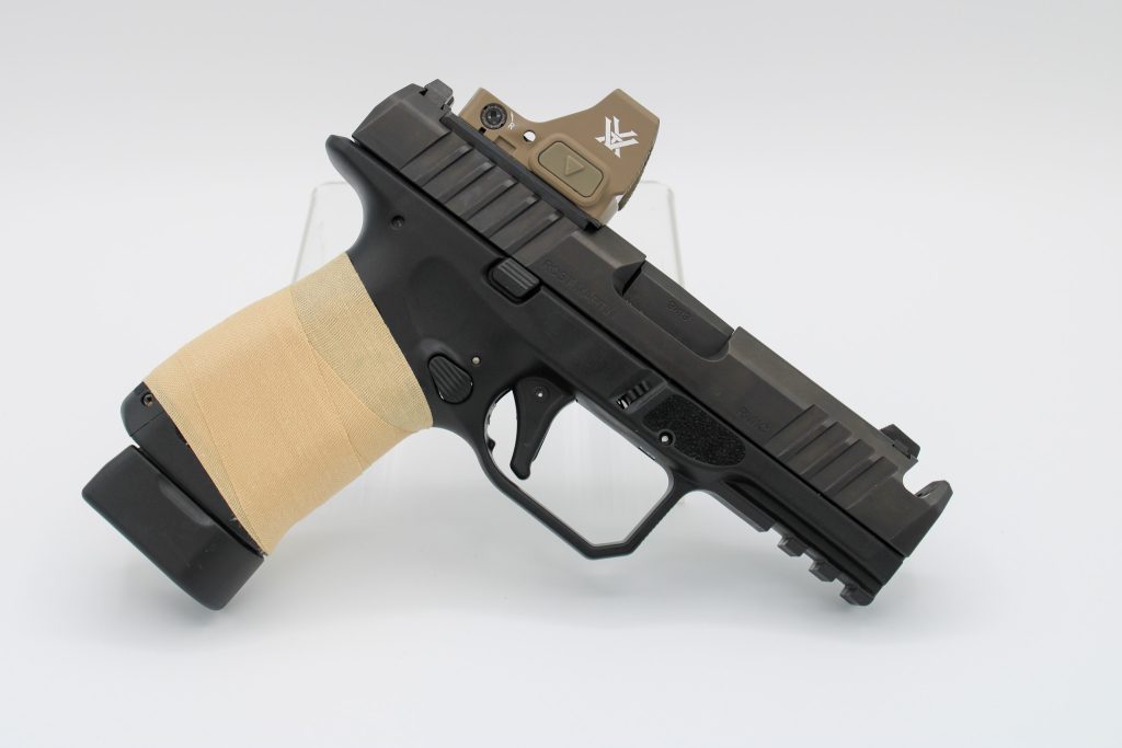 - Grip Texture: As I mentioned earlier, the texture is too slick for my liking, especially when it’s hot and humid outside and my palms get sweaty. There are several options to address this issue with grip tape. There’s specific “gun tape” available, but I usually use Howie’s hockey tape. It’s inexpensive and works well. For this project, however, I chose Goon Tape’s Raid Tape in Desert Rat (paying tribute to the legendary 7th Armored Division of WWII). Plus, it gives off that tan/FDE look I was aiming for. The tape feels great and lets me build up areas I want.