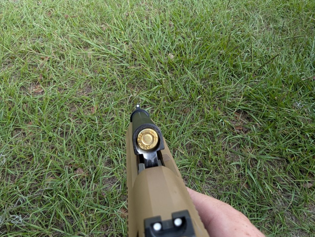 I backed off to 25 yards and started working the steel targets. I had a few silhouettes, an IPSC target, and a gong. I engaged all four without a problem. The big sights are easy to see and easily align. I went back to 50 yards and launched three rounds that finished the magazine, and each one hit the 10-inch gong.