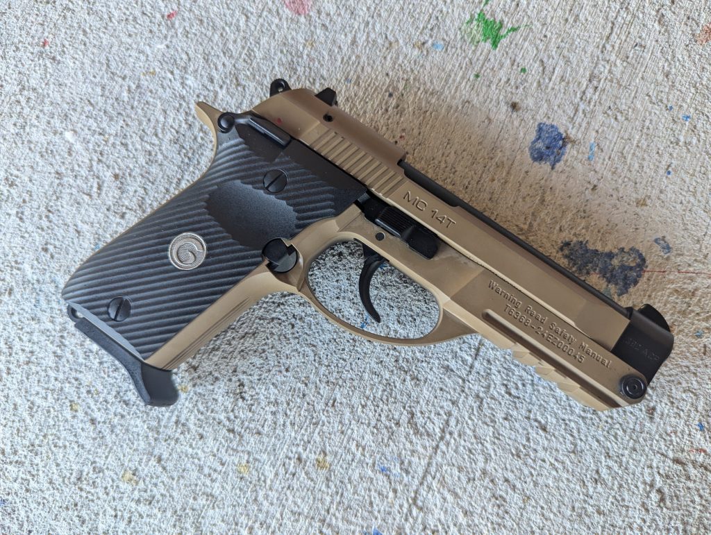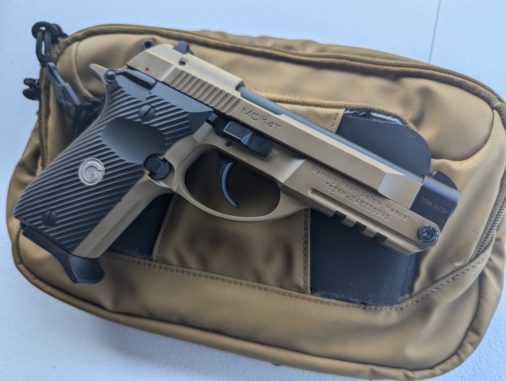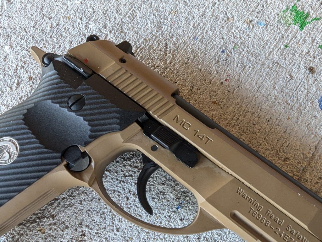 I’m a tip-up nerd and finding a Beretta 86 isn’t easy, especially at a reasonable price point. Tip-ups allow you to access the chamber with the press of a button. Push down a little and the barrel tips up. You can drop a round into the chamber without racking the slide. That can help folks with weaker hands ready or clear their handgun. The MC 14T chambers the old reliable .380 ACP round.
