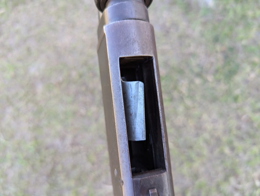 As you continue retracting the forearm, a carrier, which normally sits folded against the right of the receiver, folds downward to close the bottom of the receiver and catch a shell released by the magazine tube.