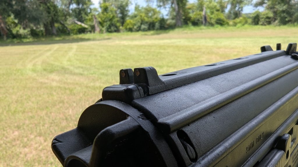 The M950’s sights are fine for the most part. They work and the gun can punch tight groups, but you havve to deal with height over bore issues. Being on top of that magazine, the sights sit super high, and for a weapon that fires 9mm and is seemingly designed for close-range shooting, that means most of your shots tend to hit low.