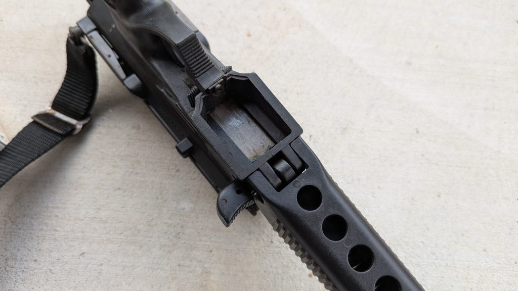 The M950 has an ambidextrous safety that sits in front of the trigger. That applied lubricant gummed the thing up terribly and was a huge pain to get free. The charging handle is located on the left side and is designed for right-handed shooters. It can’t be reversed. The magazine release is a pair of tabs on each side at the very rear of the gun.