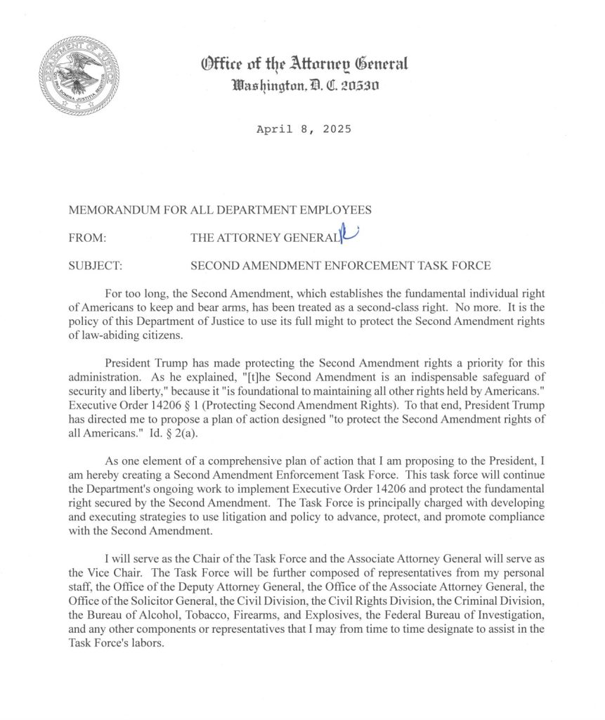In February, President Trump issued an executive order to Attorney General Pam Bondi requiring that she establish a plan of action to “examine all orders, regulations, guidance, plans, international agreements, and other actions of executive departments and agencies (agencies) to assess any ongoing infringements of the Second Amendment rights of our citizens, and present a proposed plan of action to the President, through the Domestic Policy Advisor, to protect the Second Amendment rights of all Americans.”