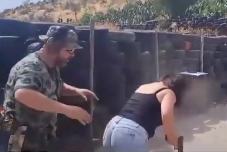 The range officer here wasn’t paying attention and his student very nearly shot herself in the foot with a negligent discharge and narrowly missed the person next to her (and Mr. Range Officer too).  What caused this?  The female shooter wore a low-cut shirt that caught a piece of hot brass.
