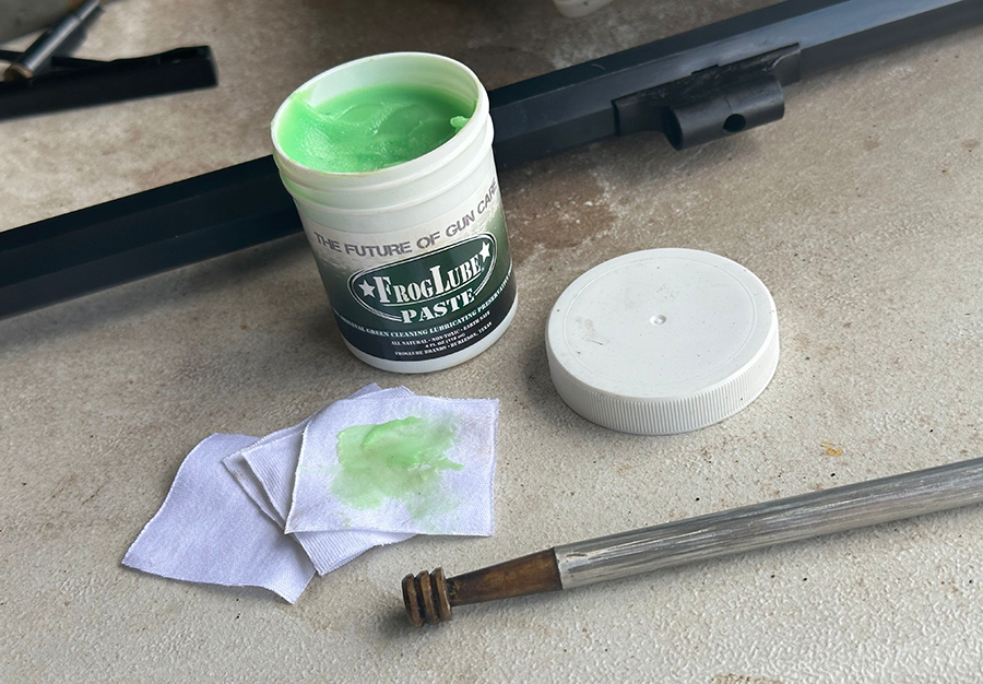 Combining petroleum based oils/lubes and loose powder and percussion caps is a no go. For muzzleloading, you will need non-petroleum lubrication. Twenty-five years ago, I didn’t have access to Froglube, a fantastic non-petroleum product. Today I do. Froglube Extreme lubricant comes in a liquid and a paste. The paste is just what the doctor ordered for lubricating patches and the bore of the gun.