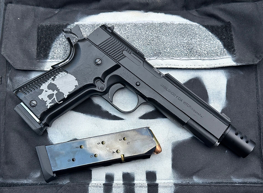 If you are a true gun guy, I’d venture to say you have a box of gun parts that you have yet to use…but plan to…some day. The three-vent, drop-in barrel bushing muzzle brake that I installed was just such a part. I can’t recall when I acquired it. Seriously, no memory, but it seemed like it would be a perfect fit for the Llama IX. I decided to refinish the pistol with Duracoat Slightly Darker Black and Snow Gray. The templates came from Duracoat and Freedom Stencils. In order to make the images stand out, I sanded down the plastic grip panels.
